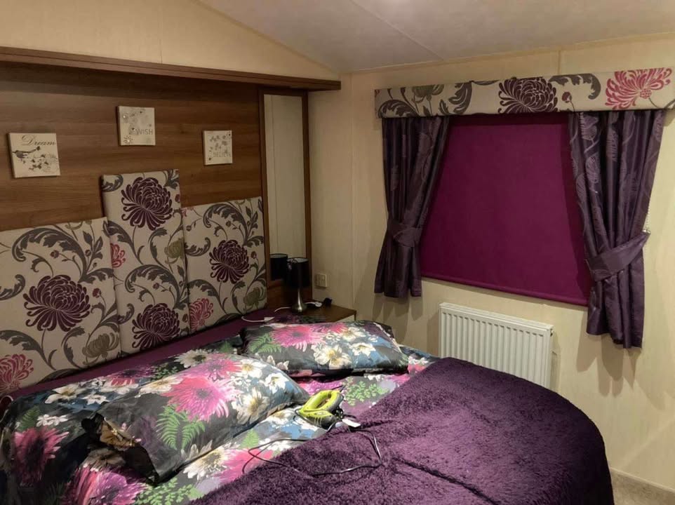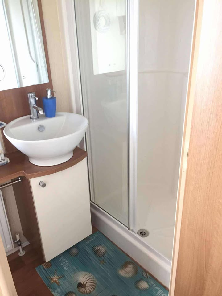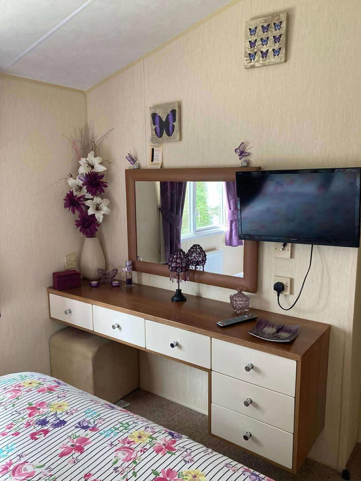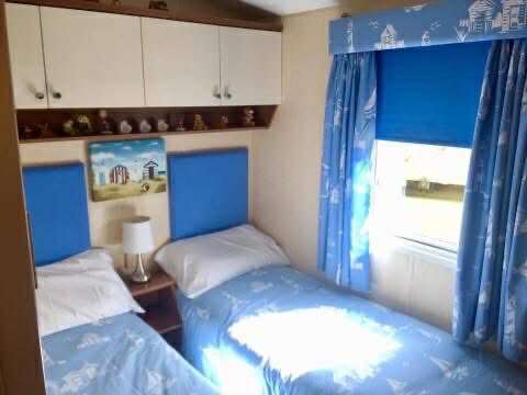 Through the door from the kitchen is a large shower room, a twin bedroom & a king size master bedroom with ensuite. Master bedroom has large sliding wardrobe with a full length mirror, large dressing table with mirror over, plenty of drawers to place all your bits & bobs, bedside cabinets, overbed/bedside lights, on the wall is a 24” flat screen Smart TV which is connected to our private WiFi. There is room in master for a travel cot. Twin room has 2 single beds, wardrobe, drawers, bedside chest, lamp & wall mounted TV. . Both bedrooms have blackout roller blinds.
