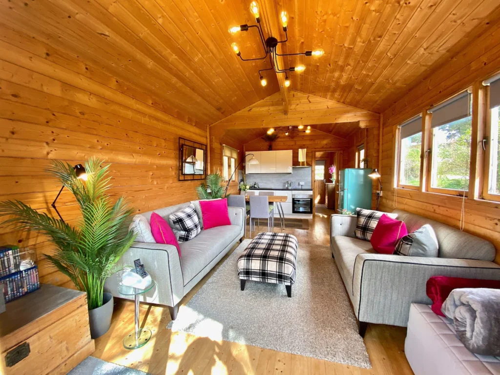 This private self-catering log cabin in Devon boasts a spacious open-plan lounge with french windows/doors overlooking our fields and stables. The outside area gives you panoramic views of the beautiful Devon countryside, whilst inside you are surrounded by the comforts of home (i.e. induction hob, electric fan oven, kettle, toaster, retro fridge with freezer compartment). There’s WIFI should you want to hop back on to the electronic highway and a large 43″ Smart Ultra HD-TV with Freeview complete with XBOX One Games System/DVD/BluRay Player – should you fancy a lazy day in this Devon log cabin retreat.